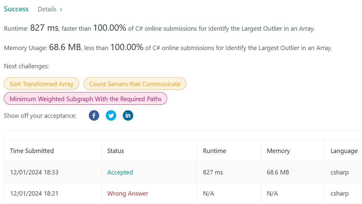 if ((sum - outlier) % 2 == 0 && vals.Contains((sum - outlier) / 2))
